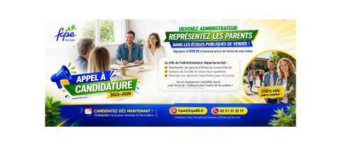 FCPE Appel à candidature - Rejoignez la FCPE85 22 mars 2026 Introduction Rejoignez la FCPE 85 et devenez acteur de l’école ! La FCPE recrute de nouveaux administrateurs.
